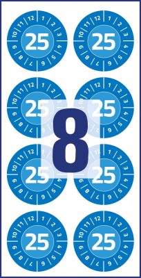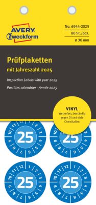 • Avery Zweckform No. 6944-2025 kék színű, 30 mm átmérőjű, öntapadós időjárásálló felülvizsgálati címke, 2025-ös évszámmal, 12 hónapos beosztással - kiszerelés: 80 címke / csomag