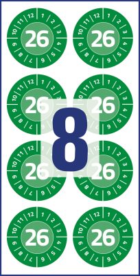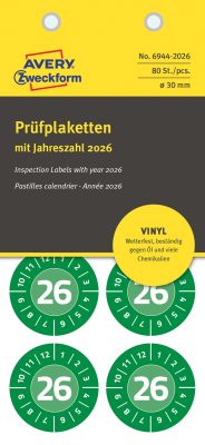 • Avery Zweckform No. 6944-2026 zöld színű, 30 mm átmérőjű, öntapadós időjárásálló felülvizsgálati címke, 2026-os évszámmal, 12 hónapos beosztással - kiszerelés: 80 címke / csomag