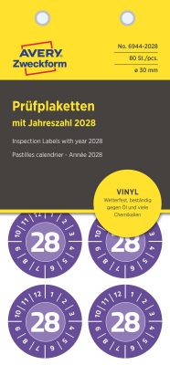 • Avery Zweckform No. 6944-2028 ibolyakék színű, 30 mm átmérőjű, öntapadós időjárásálló felülvizsgálati címke, 2028-as évszámmal, 12 hónapos beosztással - kiszerelés: 80 címke / csomag