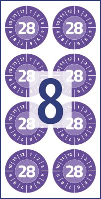 Avery Zweckform 30 mm átmérőjű, ibolyakék színű, matt felületű, időjárásálló, öntapadós felülvizsgálati címke (ellenőrzési matrica, plakett) 2028-as évszámmal, 12 hónapos beosztással, erős, tartós ragasztóval. Egy csomagban 10 lapon, összesen 80 darab, egyenként leválasztható felülvizsgálati címke található.