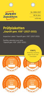 • Avery Zweckform No. 6984-2027 narancssárga színű, 30 mm átmérőjű, öntapadós időjárásálló felülvizsgálati címke, 2027-2032-es évszámmal, Geprüft gemäß VDE felirattal - kiszerelés: 80 címke / csomag