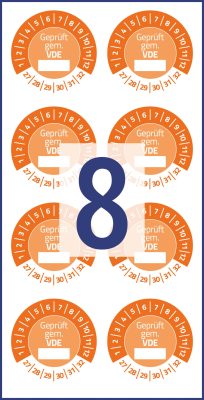 Avery Zweckform 30 mm átmérőjű, narancssárga színű, matt felületű, időjárásálló, öntapadós felülvizsgálati címke (ellenőrzési matrica, plakett) 2027-2032-es évszámmal, 12 hónapos beosztással, Geprüft gemäß VDE felirattal, erős, tartós ragasztóval. Egy csomagban 10 lapon, összesen 80 darab, egyenként leválasztható felülvizsgálati címke található.