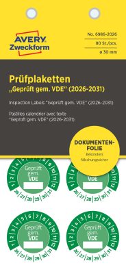 Avery Zweckform 30 mm átmérőjű, zöld színű, matt felületű, biztonsági, öntapadós hitelesítő címke (ellenőrzési matrica, plakett) 2026-2031-es évszámmal, 12 hónapos beosztással, Geprüft gemäß VDE felirattal, biztonsági ragasztóval. A speciális anyagának és ragasztórétegének köszönhetően a címkét nem lehet nyom nélkül áthelyezni, eltávolítani. Egy csomagban 10 lapon, összesen 80 darab, egyenként leválasztható hitelesítő címke található.