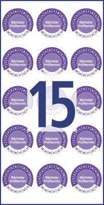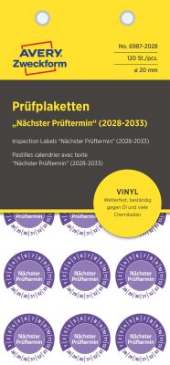 Avery Zweckform 20 mm átmérőjű, ibolyakék színű, matt felületű, időjárásálló, öntapadós felülvizsgálati címke (ellenőrzési matrica, plakett) 2028-2033-as évszámmal, 12 hónapos beosztással, Nächster Prüftermin felirattal, erős, tartós ragasztóval. Egy csomagban 8 lapon, összesen 120 darab, egyenként leválasztható felülvizsgálati címke található.
