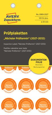 • Avery Zweckform No. 6989-2027 narancssárga színű, 20 mm átmérőjű, öntapadós biztonsági hitelesítő címke, 2027-2032-es évszámmal, Nächster Prüftermin felirattal - kiszerelés: 120 címke / csomag