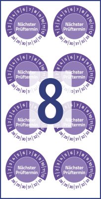 Avery Zweckform 30 mm átmérőjű, ibolyakék színű, matt felületű, biztonsági, öntapadós hitelesítő címke (ellenőrzési matrica, plakett) 2028-2033-as évszámmal, 12 hónapos beosztással, Nächster Prüftermin felirattal, biztonsági ragasztóval. A speciális anyagának és ragasztórétegének köszönhetően a címkét nem lehet nyom nélkül áthelyezni, eltávolítani. Egy csomagban 10 lapon, összesen 80 darab, egyenként leválasztható hitelesítő címke található.