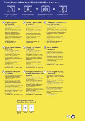 Felhasználási javaslat: a sokoldalúan felhasználható öntapadós címketartó tábla (placard címkehordozó, öntapadós címkehordozó tábla) hatékony címkézési megoldás raktározásban és a logisztikában. Amennyiben gyakran kell változtatnunk a címkéket tárolódobozokon, konténer dobozokon, szállítóládákon, polcokon, akkor egy idő után az eltávolított címkék csúnya címke- és ragasztómaradványokat hagynak maguk után. Erre a problémára jelenthet nagyszerű megoldást egy megbízhatóan megtapadó, robosztus kivitelű címkehordozó, melynek különleges felülete alkalmas folyamatosan változó címkézésre. Bármilyen címkével vagy matricával, tetszés szerint bármennyiszer használható. Az öntapadó címkehordozó segítségével sok idő és költség takarítható meg.