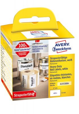 • Avery Zweckform No. A1933084 fehér színű 57 x 32 mm méretű, nyomtatható öntapadós tekercses időjárásálló etikett címke, erős, tartós ragasztóval - kiszerelés: 400 címke / tekercs, 1 tekercs / doboz