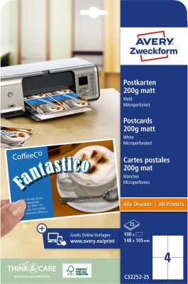 • Avery Zweckform No. C32252-25 univerzális 105 x 148 mm méretű, 200 g-os matt, kétoldalas fehér nyomtatható levelezőlap, mikroperforált élekkel A4-es íven - 100 levelezőlap / csomag (Avery C32252-25)