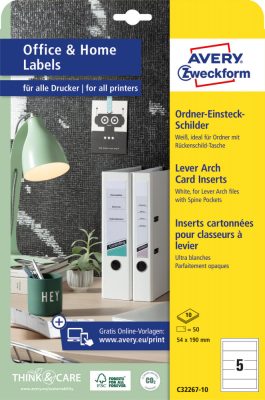 • Avery Zweckform No. C32267-10 fehér színű 190 x 54 mm méretű, univerzálisan nyomtatható iratrendező betétlap, mikroperforált élekkel A4-es íven - kiszerelés: 50 betétlap / 10 ív