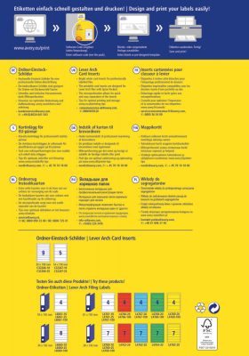 Avery Zweckform home office iratrendező betétlapokPraktikus, kis kiszerelésű nyomtatható iratrendező betétlap, mely ideális választás otthoni, kisirodai, vagy akár home office felhasználásra is. Tintasugaras nyomtatókban, fekete-fehér lézernyomtatókban és színes lézernyomtatókban egyaránt nyomtatható öntapadós etikett címke.