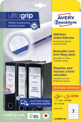 Avery Zweckform No. L4760REV-20 fehér színű 192 x 38 mm méretű, univerzálisan nyomtatható, öntapadós iratrendező címke, visszaszedhető ragasztóval A4-es íven - kiszerelés: 210 címke / 30 ív