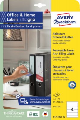 • Avery Zweckform No. L4761REV-10 fehér színű 192 x 61 mm méretű, univerzálisan nyomtatható, öntapadós iratrendező címke, visszaszedhető ragasztóval A4-es íven - kiszerelés: 40 címke / 10 ív