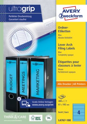 Avery Zweckform No. L4767-100 kék színű 192 x 61 mm méretű, univerzálisan nyomtatható, öntapadós iratrendező címke, permanens ragasztóval A4-es íven - kiszerelés: 400 címke / 100 ív