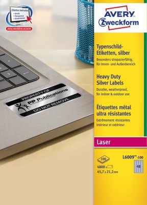 • Avery Zweckform No. L6009-100 ezüst színű 45,7 x 21,2 mm méretű, lézernyomtatóval nyomtatható, öntapadós ipari etikett címke, erős, tartós ragasztóval A4-es íven - kiszerelés: 4800 címke / 100 ív