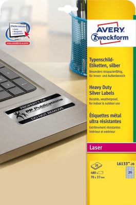 Avery Zweckform No. L6133-20 ezüst színű 70 x 37 mm méretű, lézernyomtatóval nyomtatható, öntapadós ipari etikett címke, erős, tartós ragasztóval A4-es íven - kiszerelés: 480 címke / 20 ív