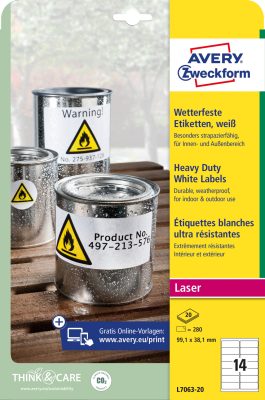 Avery Zweckform No. L7063-20 fehér színű 99,1 x 38,1 mm méretű, lézernyomtatóval nyomtatható, öntapadós időjárásálló etikett címke, erős, tartós ragasztóval A4-es íven - kiszerelés: 280 címke / 20 ív