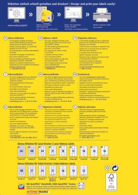 Borotvaéles nyomtatási képA minőségi alapanyagoknak köszönhetően a nyomatot borotvaéles képek (vékony, határozott, tisztán látható kontúrok), kiváló toner tapadás, valamint elkenődésmentes felület jellemzi. Az Avery Zweckform címkéken kiváló nyomtatási eredményt érhetünk el, melyek 100%-ban kompatibilisek az általánosan használt nyomtatókkal (HP, Epson, Canon, Brother, Samsung, Kyocera, Lexmark, OKI).