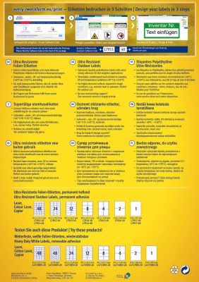 Ultra ellenálló címkékEz a polietilén, időjárásálló öntapadó címke sokkal ellenállóbb a környezeti hatásokkal szemben, mint egy hagyományos papírcímke. Főbb jellemzői: olaj-, szennyeződés-, víz-, UV- és hőálló (-40°C-tól +150°C-ig), továbbá tengervízálló és téphetetlen. Különösen erős tapadás a legkülönfélébb felületeken. Nem öregszik el, ellenáll számos oldószernek és tisztítószernek. Kültéri és beltéri használatra egyaránt alkalmas. Az erős és tartós tapadásnak köszönhetően a felhasználási területei igen szélesek.