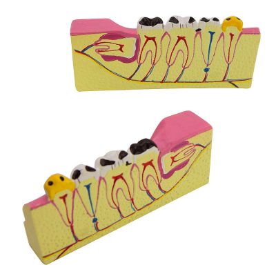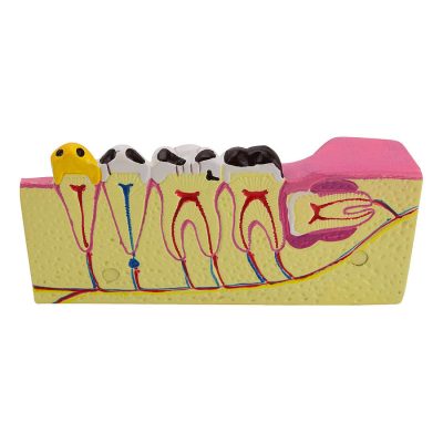 Az alsó állkapocs részleges modellje az emberi őrlőfogakat mutatja be különböző betegségekkel. Az üregek különböző stádiumokban jelennek meg - a felületes üregtől a korona teljes megromlásáig. A 2 részből álló modell hosszanti irányban szétválasztható a belső részek részletes megtekintéséhez.