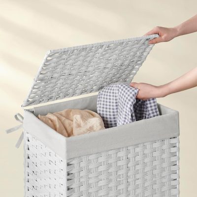 • [Polipropilén rattan és fémszerkezet] A szennyeskosárhoz kézzel szőtt polipropilén rattan vízálló és légáteresztő, így ruhái mindig szárazak és jól szellőzők maradhatnak. A fémkeret stabil és erős, hogy akár 25 kilogrammot is elbírjon.