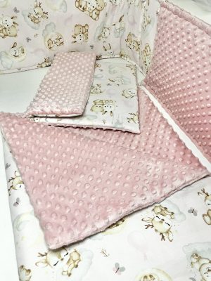 • Bbaby 3 részes egybevarrt babaágynemű – Állatbarát Álom, rózsaszín és púder minky, állatmintás pamutvászon és fejvédő