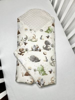 A külső oldala bézs pöttyös minky, amely finom melegséget nyújt, míg a belső oldala 100% OEKO-TEX pamutvászon, vidám dínós mintákkal, teknősökkel és erdei részletekkel díszítve.