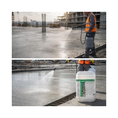 • A friss beton felületén kialakuló filmréteg jelentősen mérsékli a víz elpárolgását a kötés időszaka alatt. Ez különösen fontos meleg, szeles vagy alacsony páratartalmú környezetben, ahol a beton túl gyorsan veszítene nedvességtartalmából.