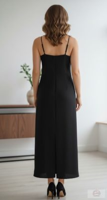 Csábító sziluett: A ruha elöl zárt, elegáns esésű, míg hátul egy magabiztosságot sugárzó felvágás biztosítja a szabad mozgást és a látványos megjelenést.
