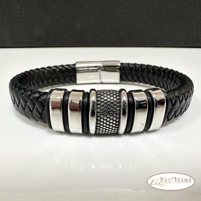 Férfi karkötő nemesacél-bőr kombinációval.