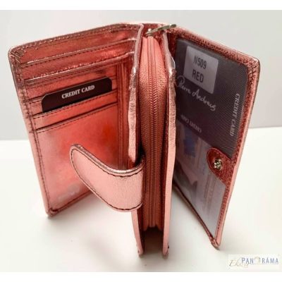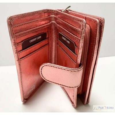 Rose arany-pirosas színű elegáns, nőies darab. Két oldalra nyíló bankjegy és kártya tartó, középen cipzárral záródó két fakkos érme tartó.