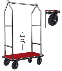 Ez a háromszög alakú felső résszel és piros szőnyeggel ellátott csiszolt inox bőröndszállító nem csupán a poggyász szállítására kiváló! A speciális kialakítás még stabilabbá teszi a nagyobb vagy szabálytalan formájú bőröndök szállítását is. Használható welcome drinkek vagy exkluzív bekészítések elegáns és látványos tálalására is a vendégszobákba. A csiszolt rozsdamentes acél váz és a piros szőnyeg kombinációja modern, professzionális és egyedi hatást kelt. A ruhatartó sín pedig ideiglenes akasztási lehetőséget nyújt a vendégek számára érkezéskor.