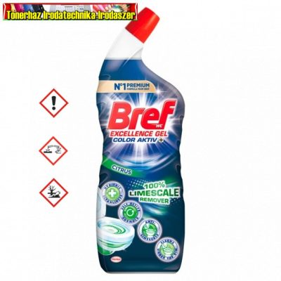 Használat előtt olvassa el, használat közben pedig tartsa be a termék használati útmutatóját és a figyelmeztetéseket. Csak WC-ben használható. Amennyiben a termék kifröccsen azonnal öblítse le tiszta vízzel. Ne keverje fehérítővel vagy más tisztítószerrel, mert az mérgező klórgáz vagy hő képződését okozhatja. BELÉGZÉS ESETÉN: Vigyük a sérültet friss levegőre, és tartsuk olyan helyzetben, hogy kényelmes legyen a légzés. BREF EXCELLENCE GEL COLOR AKTIV+. Folyékony WC tisztítószer. Veszély. Hidrogén-kloridot, 2,2'-(Octadec-9-enylimino)bisethanol-t tartalmaz. Fémekre korrozív hatású lehet. Súlyos égési sérülést és szemkárosodást okoz. Légúti irritációt okozhat. Ártalmas a vízi élővilágra, hosszan tartó károsodást okoz. Orvosi tanácsadás esetén tartsa kéznél a termék edényét vagy címkéjét. Gyermekektől elzárva tartandó. Az eredeti csomagolásban tartandó. A gőzök belélegzése tilos. A használatot követően a kezet alaposan meg kell mosni. LENYELÉS öblíteni. TILOS hánytatni. HA BŐRRE (vagy hajra) KERÜL: Az összes szennyezett ruhadarabot azonnal le kell vetni. A bőrt le kell öblíteni vízzel [vagy zuhanyozás]. SZEMBE KERÜLÉS ESETÉN: Több percig tartó óvatos öblítés vízzel. Adott esetben a kontaktlencsék eltávolítása, ha könnyen megoldható. Az öblítés folytatása. Expozíció vagy annak gyanúja esetén: Forduljon TOXIKOLÓGIAI KÖZPONTHOZ/orvoshoz. A szennyezett ruhát újbóli használat előtt ki kell mosni. A kiömlött anyagot fel kell itatni a körülvevő anyagok károsodásának megelőzése érdekében. Elzárva tárolandó. Saválló bélésű edényben tárolandó. A tartalom/edény elhelyezése hulladékként: a nemzeti előírásoknak megfelelően.