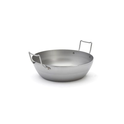 A Lyonnaise vonal optimalizált vastagsága miatt a serpenyő a méretéhez képest kezelhető marad. A két hegesztett fül ennél az átmérőnél nem extra, hanem alapfeltétel: stabil és biztonságos mozgatást ad teljes terhelés mellett is.