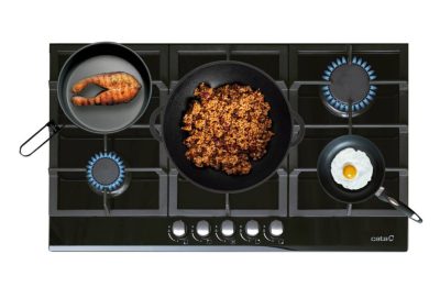 5 gázégő égésbiztosítóval, automata szikragyújtás, fekete üveg felület, öntöttvas rács, teljesítmény: 11 kW, 2 db közepes gázégő - 2x1,75 kW, 1 db tripla koronás WOK gázégő - 3,5 kW, 1 db nagy gázégő - 3 kW, 1 db normál gázégő - 1 kW