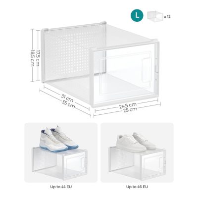 cipős dobozok, 12 db egymásra rakható cipőtároló rendszer, összecsukható és sokoldalúan használható tornacipőkhöz, UK 10-es méretig használható, kombinálható tároló, átlátszó és fehér LSP12MWT