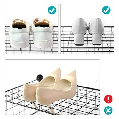 A fém drót cipőtartó különböző formákba szerelhető, hogy pontosan illeszkedjen ahhoz, amire szüksége van. Több egység kombinálható a több tárolás és lehetőség érdekében; A polcot el is távolíthatja, hogy magasabb helyet hozzon létre a csizmák számára. Ez az egység kreatív és egyedi teret kínál.