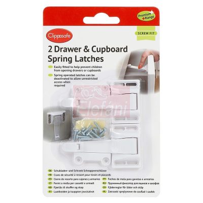 - Könnyen felszerelhető rugós biztonsági zár amely megakadályozza, hogy a gyermek kinyissa a szekrényeket, fiókokat