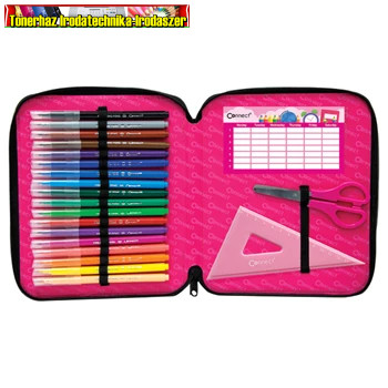 Egyrészes, írószerrel töltött, cipzáras tolltartó. Belül nyomott mintás textillel bevont merev lapokkal, gumis kialakítással az írószerek tárolásához.