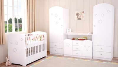 A termék nyitott polcos és zárt részeket egyaránt tartalmaz mely egyszerre kiváló kiegészítője a bal és jobb oldali ajtós elemnek, és megállja a helyét mint egy egyedülálló szekrény is. Az ajtón található íves felső résznek és az ajtón elhelyezett mart csillagoknak köszönhetően egy igazán kellemes, gyermeki hangulatot kölcsönöz a szobának.