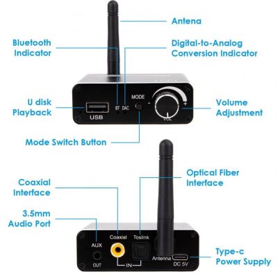 Ez a termék számos funkcióval rendelkezik, többek között Bluetooth vevővel, digitális-analóg, U Disk lejátszó és minden az egyben audio konverterrel. Támogatja az okostelefon zenéinek vagy FM rádiójának vezeték nélküli jeleinek vételét. Támogatja az SPDIF (Toslink, Optikai) sztereó analóg 3,5 mm-es R/L jack csatlakozóval történő konvertálását is. Automatikusan felismeri és olvassa az U Disk zenéit, például WAV és MP3 formátumot. Alkalmas HDTV-hez, játékkonzolokhoz, CD-lejátszókhoz. Tökéletesen megoldja az audioeszközök vagy -eszközök korlátait.