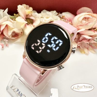• Digitális karóra , női, kör alakú, arany színű tokkal, rózsaszín szilikon szíjjal