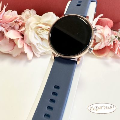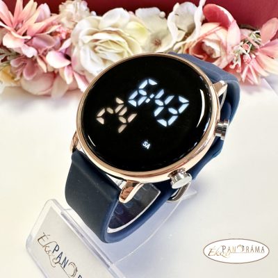 • Digitális karóra , női, kör alakú, arany színű tokkal, sötétkék szilikon szíjjal