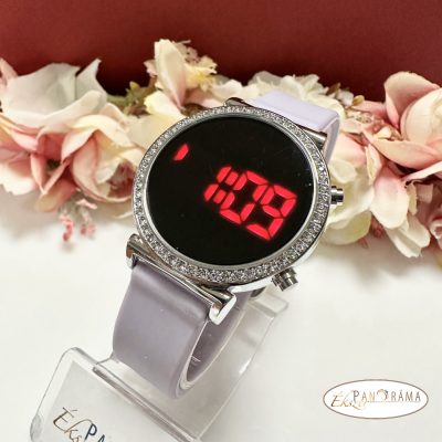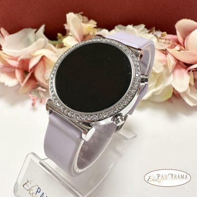 • Digitális karóra , női, kör alakú, ezüst színű kristályos tokkal, lila szilikon szíjjal