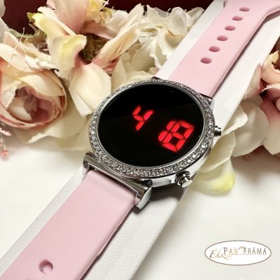 • Digitális karóra , női, kör alakú, ezüst színű kristályos tokkal, rózsaszín szilikon szíjjal