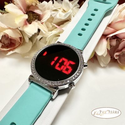 • Digitális karóra , női, kör alakú, ezüst színű kristályos tokkal, zöld szilikon szíjjal
