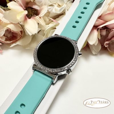• Digitális karóra , női, kör alakú, ezüst színű kristályos tokkal, zöld szilikon szíjjal