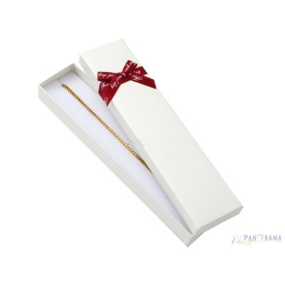 Hosszúkás doboz, nyaklánc és karlánc ajándékozására, tárolására! Fehér színű, piros masnival díszítve.