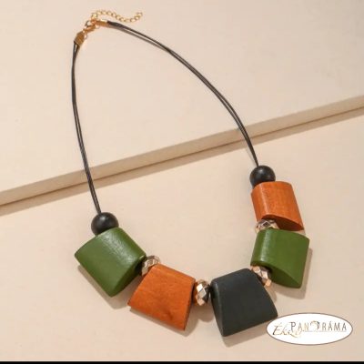 Minden évszakban feldobhatja ruhatárát ezzel az ízléses nyakékkel. Színes fa elemekkel, arany színű betéttel, szerelékkel eleganciát sugároz!