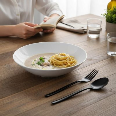 A 20 cm-es méret tökéletes például egy krémleves vagy rizottó tálalásához, ahol a színek és textúrák szépen kiemelkednek a sötétebb alapon.